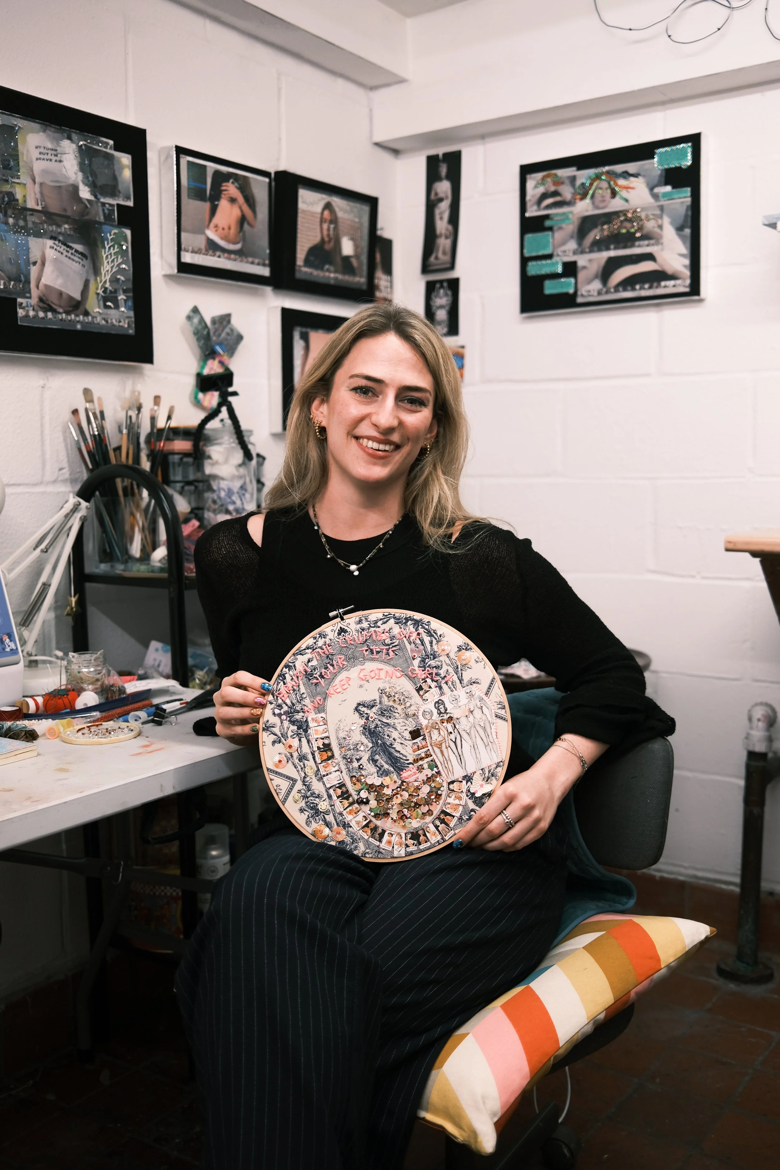 As her creations wink as an invitation to admiration, studio visitors are susceptible to desiring a closer look. Approaching to inspect, the initial spark of intrigue is sobered by the sense that what they esteemed would be an exuberant piece of art, offers much more. Beyond her love for adornment, the great unseen motivator for Coco’s practice is the chronic uterine condition known as endometriosis.