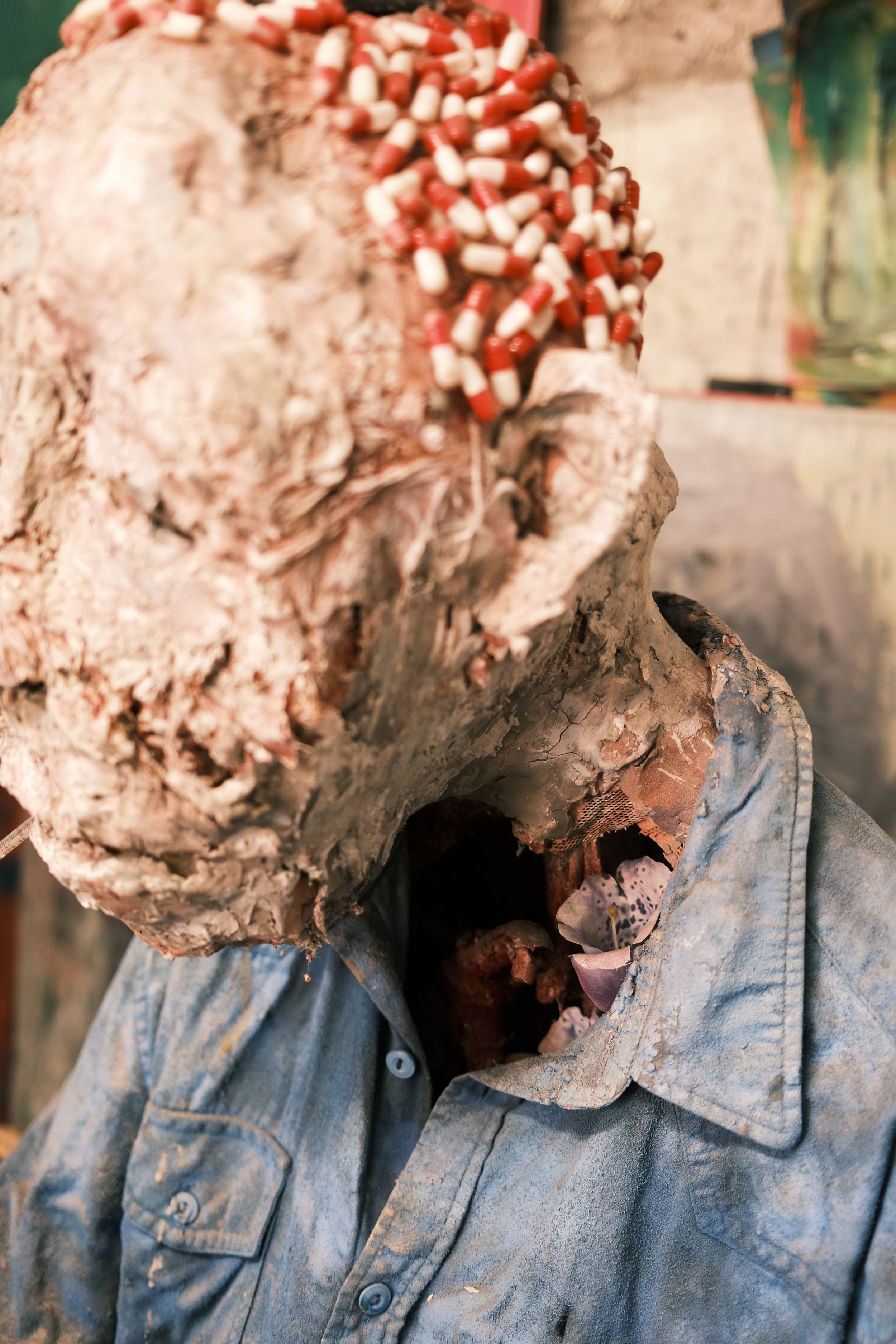 Constructed using a wooden skeleton and plastered skull, Pharmacist is a mixed-media piece focusing on the realities of the unhoused population, substance abuse, and our growing reliance on prescribed medication. Through Pharmacist, David acknowledges the co-occurrence, persistence, and interrelation of these complex issues, exploring what constitutes their contingency and our susceptibility.